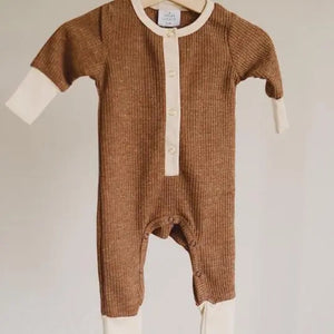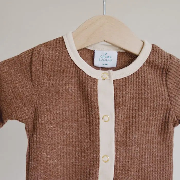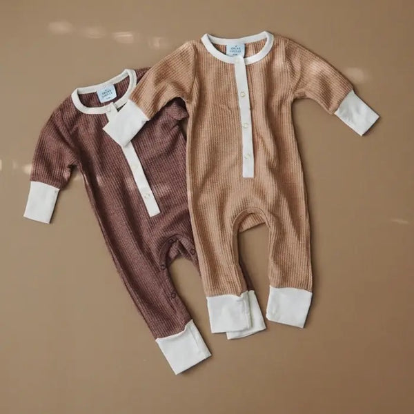 Long sleeve henley romper in a cozy waffle fabric your little ones can wear all day long.